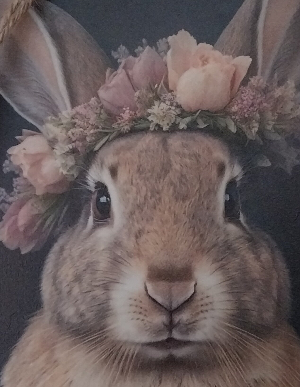 Deco schilderijtje konijntje krans , zo lief. Het schilderijtje heeft de afmeting breedt 15 cm en hoog 21 cm